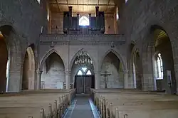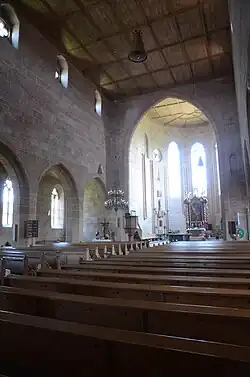 Auch im Inneren der Kirche sind die Sandsteinquader zu sehen, der Verputz wurde 1875 entfernt. Das Saal- und Chorgewölbe ist durch das Einfügen von flachen Holzdecken nicht mehr zu sehen. Spitzbogenarkaden an der Nord- und Südseite grenzen das Mittelschiff von den Seitenschiffen ab. Seit 1870/80 gibt es eine Westempore, die auf Spitzbogenarkaden ruht. Das Mittelschiff ist durch eine Spitzbogenarkade mit dem Chor verbunden.