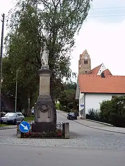 Der Rechteckpfeiler mit Inschriftenplatte erhebt sich auf einem würfelförmigen Podest mit Girlandenzierrat. Die Steinfigur der Maria Immaculata wurde von der Baldauf'schen Kunstanstalt in Augsburg geschaffen.