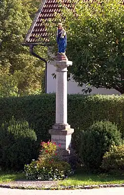 Die farbig gefasste Muttergottesfigur wird von einer Steinsäule auf rechteckigem Steinpodest getragen.