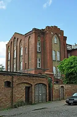 Die Fassade ist im Stil der Neogotik gehalten. Geschossübergeifende spitzbogige Blenden prägen die Ansicht. An den Schmalseiten sind flache Treppengiebel ausgeführt und unter der Traufe ein Spitzbogenfries.