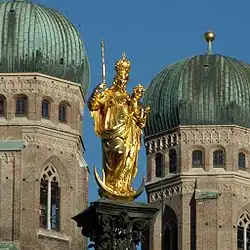 In der christlichen Ikonographie wird Maria oft – in Anlehnung an (Offb 12,EU ) – als die „apokalyptische Frau“ bzw. Herrscherin mit Sternenkranz, Krone, Zepter bzw. auf dem Mond (oder einer Mondsichel) stehend – mit dem (meist ebenfalls mit Krone und Zepter ausgestatteten) Kind auf dem Arm – dargestellt. Diese Darstellungsform bezeichnet man als Mondsichelmadonna. Maria wird als die „Königin des Himmels und der Erde“ (s. o.: vollendeter Mensch bei Gott) dargestellt, die den Gläubigen durch ihre Fürbitte vor Gott helfen kann. In überwiegend katholischen Gegenden sind an vielen Orten – oft in der Ortsmitte – sogenannte Mariensäulen aufgestellt, etwa in München auf dem Marienplatz.