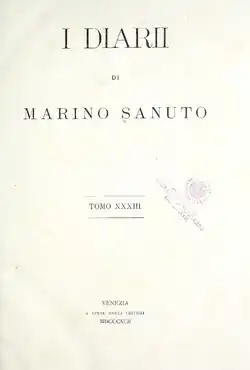 - I Diarii, hrsgg. von Rinaldo Fulin, Federico Stefani, Nicolo Barozzi, Guglielmo Berchet, Marco Allegri, 58 Bände, Venedig 1879–1903; Auszug hrsg. von Paolo Margaroli, 1977.