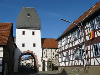 Marköbel mit den markanten Gebäuden Obertor, Kirche, Untertor (v.l.r)