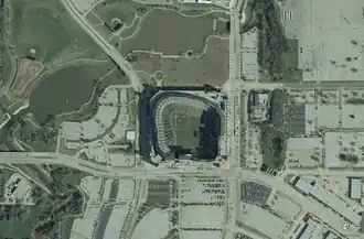 | Luftbild des Rangers Ballpark, links oben der Mark Holtz Lake | ||