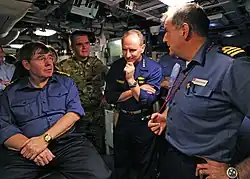 Admiral Mark Stanhope (links) im Gespräch mit US-Admiral Jonathan W. Greenert, dem Chief of Naval Operations der US Navy, an Bord des Atom-U-Bootes Astute (2012).