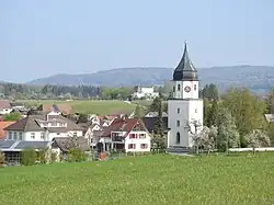 - Die Pfarrkirche St. Laurentius wurde 1612 als einschiffige Saalkirche erbaut.[1] Sie stammt in ihren wesentlichen Teilen aus der Spätgotik und hat eine reiche Ausstattung, zu der die zahlreichen um 1615 entstandenen bedeutenden Wandgemälde zählen (Engelmotive im Altarraum). Der gewölbte Chorturm im Osten erhielt 1612 einen oktogonalen Renaissance-Aufbau und sehr wahrscheinlich 1730/1740 die geschweifte Haube. 1886 wurde von dem Orgelbauer Xaver Mönch für die St. Laurentius-Kirche die Orgel gebaut (Opus 17). Sie steht seit 1987 in der St. Zeno-Kirche in Stahringen.[5] Die Kirche wurde durch den erzbischöflichen Baurat Julius Hitzel renoviert.