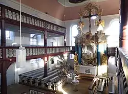 Das Innere ist ursprünglich in schlichten Farben gehalten (weiß, hellblau, grau). Schmuck fehlt, nur an Kanzel und Altar sind Vergoldungen zu finden. Weitere Ausschmückungen erhielten heutige Kirchengebäude später oder in jüngster Zeit.