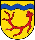 Blasonierung: „In Gold (Gelb) unter einem blauen Wellenbalken im Schildhaupt eine gebogene rote Hirschstange mit sechs Enden und kleeblattartigen Ansatz.“[2] |