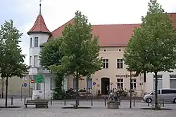 - Das Haus Markt 5 wurde Anfang des 18. Jahrhunderts erbaut. Das Nachbarhaus gehört zur Zinnaer Straße. Es ist ein zweigeschossiges Fachwerkhaus mit Krüppelwalmdach. Hier, und im Haus Zinnaer Straße 17, befand sich der Gasthof Zu den Sieben Kurfürsten. Philipp Hainhofer beschrieb die Gaststätte 1617 als eine der besten in Deutschland. Das Haus brannte im Dreißigjährigen Krieg ab, die Kelleranlage aus der Zeit ist noch vorhanden.