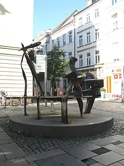 Gegenüber dem Rathaus standen früher ein Marktbrunnen, der bis zur Einrichtung eines Wasserleitungssystems Ende des 19. Jahrhunderts zur Wasserversorgung der Bürger diente[k 4] und ein Pranger.[5] Der 1910 vor dem damaligen Residenzcafé an der Südseite aufgestellte Zierbrunnen Rettung in Seenot im Jugendstil mit Bronzeplastiken von Hugo Berwald war eine Spende der reichen Kommerzienrätin und Kaufmannswitwe Emma Mühlenbruch. Ihr verstorbener Mann war Gönner der Seenotrettungsgesellschaft, wodurch die Motivwahl begründet ist. Der Brunnen wurde, da die Anlage für den Markt zu groß erschien, 1927 auf den Vorplatz des Hauptbahnhofs versetzt, wo er noch steht.[3][12][13] Von 1908 bis 1938 durchquerte auf der Königsstraße (heute Puschkinstraße) eingleisig die Straßenbahn der Linie 1 den Platz.