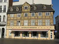 Dieses Haus besitzt auf der Marktseite eine in gelb gehaltene barocke Giebelfassade sowie einen Fachwerkgiebel auf der Schlachtermarkt-Seite. Die vordere Fassade wurde nach Abriss des Hauses 1975 dem historischen Vorbild aus dem Jahr 1700 nachempfunden.[k 6] Sie ähnelt damit dem Original, wie es bis zu seiner Umgestaltung 1835 Bestand hatte.[7] Beim Abriss des Gebäudes konnten baugeschichtliche Details gewonnen werden. Das Zellengewölbe im Erdgeschoss, das Tonnengewölbe im Keller und der rückseitige Fachwerkgiebel aus dem 17. Jahrhundert gingen bei den Abbrucharbeiten verloren. Letzterer wurde vorwiegend aus Gründen der städtebaulichen Geschlossenheit am Schlachtermarkt ebenfalls rekonstruiert und vorgeblendet. Beim Rückbau des Gebäudes wurden Leinwandtapeten aus dem 17. Jahrhundert und eine bemalte Bretterdecke sichergestellt.[17]