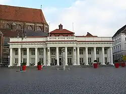 Dieses Gebäude wird im Volksmund auch Säulengebäude oder Krambudengebäude genannt. Der Bau entstand 1783 bis 1785 nach Entwürfen Johann Joachim Buschs als Markthalle, an die die Reliefs mit Rad und geflügeltem Merkurstab als Symbole des Handels erinnern. Das Gebäude weist Merkmale des Barocks und des Klassizismus auf und besitzt eine Attika sowie längs der Vorderfront eine Säulenvorhalle mit 14 dorischen Säulen, zwei Stützen und ein Triglyphenfries. Das barocke Mansarddach ist über dem Mittelrisalit des Gebäudes mit einem pavillonartigen Dachaufbau ausgestattet, an dessen Spitze sich ein kunstvoll gestalteter, zentraler Schornstein befindet.