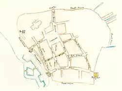 Nur ein Teil der ursprünglich etwa 75 × 75 Meter großen und heute größtenteils bebauten Marktfläche überschneidet sich im Südosten mit dem heutigen Grundriss. Dadurch, dass neu gegründete Städte wie Wismar und Parchim günstiger an schiffbaren Wasserwegen lagen, ging der Handel in Schwerin zurück, der Markt wurde nach und nach bis auf eine kleine Restfläche (60 × 20 m[3]) bebaut.[k 1] Selbst Marktbuden wurden aufgrund des Bevölkerungszuwachses in Wohnhäuser umgestaltet. Es war eine enge Wohnbebauung mit hohen, schmalen Häusern ohne Hof und Garten.[3] Erst nach dem verheerenden Stadtbrand 1651, der in einer Schmiede hinter dem Rathaus ausgebrochen war und mit 150 Häusern beinahe die gesamte Altstadt in Schutt und Asche gelegt hatte, erhielt der Markt nach den Plänen des Stadtbaumeisters Johann Wedel in etwa seine heutige Grundfläche, wobei sich der Mittelpunkt leicht nordwestlich verlagerte. Wedel erstellte 1651 einen Wiederaufbauplan, in dem neben dem neuen Grundriss auch die alten Straßenverläufe eingezeichnet waren. Stadtkommandant Oberst Görzen verlangte die Errichtung ansehnlicher barocker Giebelhäuser am Markt, dabei sollten Häuserreihen geradlinig verlaufen und zum Schutz vor Bränden keine Reet- oder Strohdächer erhalten. Da vielen Bürgern für den Wiederaufbau der Häuser das Geld fehlte, wurde im Reich um Spenden gebeten. Von den erzielten über 3000 Reichstalern wurden 1200 für den Wiederaufbau des Rathauses verwendet, der Rest wurde an die Bürger verteilt. Von ihnen erhielten die meisten etwa 10 bis 20 Reichstaler, was ohne Eigeninitiative nicht zum Aufbau einer neuen Existenz genügte.[k 2] Das neue barocke Rathaus wurde 1654 vollendet, wobei nur wenige Bauteile aus der Renaissance Verwendung fanden. Auch die sonstige Wohnbebauung muss bis 1654 fast fertiggestellt worden sein, wobei größtenteils Fachwerkhäuser, deren Giebel in Richtung Markt zeigten, errichtet wurden. Mit dem Bau des Neuen Gebäudes von 1783–1785 an der Nordseite des Marktes war die Marktfläche um einige Meter erweitert, planiert und gepflastert worden.[3]