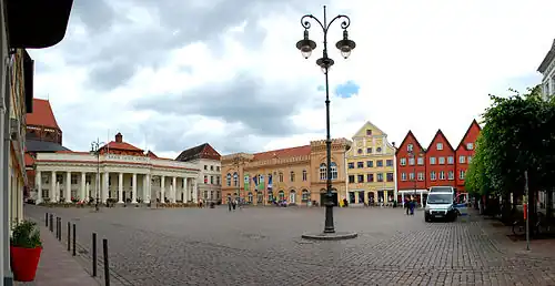Über Jahrhunderte bildete der Markt das politische, wirtschaftliche und religiöse Zentrum der Stadt, wenngleich aufgrund der ungünstigen Lage zu den Verkehrswegen der Fernhandel nicht florieren konnte.[k 3] 1807 war der Marktplatz Schauplatz der pompösen Einzugszeremonie von Herzog Friedrich Franz I., als dieser nach dem Frieden von Tilsit wieder in seine Rechte als Landesherr eintrat.