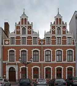 - Nr. 15: 2-gesch. Kommandantenhaus Wismar vom späten 16. Jahrhundert (D) im Stil der Niederländischen Renaissance als Giebelhaus gebaut; heute mit der Sparkasse
