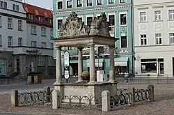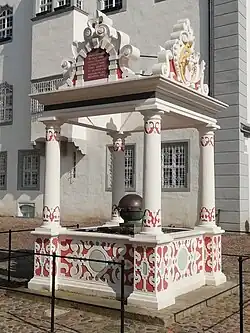 Der heutige im Stil der Renaissance gebaute Brunnen entstand 1617 und ersetzte einen 1524 gebauten Brunnen. Der Brunnen verfügt über ein aus Sandstein gefertigtes quadratisches Becken. Auf den Ecken befinden sich toskanische Säulen mit Architrav. Die Aufsätze sind reich mit Tuchgehängen, Masken und Rollwerkkartuschen verziert. Mehrfach fanden Instandsetzungen statt, so auch 1967.