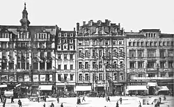Bis zum Bombenangriff vom 4. Dezember 1943 war die Westseite des Marktes mit Geschäftshäusern bebaut. Am südlichen Ende, an der Ecke zur Thomasgasse stand das nach Plänen des Architekten Ottomar Jummel 1894 errichtete Bismarckhaus. Benachbart Stieglitzens Hof, ebenfalls 1894 vom gleichen Architekten errichtet, war der Folgebau eines Renaissancegebäudes von 1733. Stieglitzens Hof war ein Durchgangshof zur Klostergasse. In der Klostergasse, Ecke Thomasgasse befand sich das um 1900 abgerissene Hotel „Stadt Berlin“.[1] Nach der schmalen Engel-Apotheke von 1728 folgte mit Aeckerleins Hof wiederum ein Durchgangshof mit einer Barockfassade von 1714 von Johann Gregor Fuchs. Den Abschluss vor dem Barfußgäßchen bildete die 1845/1846 errichtete Kaufhalle. Beim Bombenangriff von 1943 wurde die gesamte Gebäudereihe bis auf die Kaufhalle zerstört und stand teilweise als Ruine noch bis 1960.