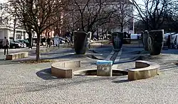- Auf der östlichen Eingangsseite gestaltete man im Jahr 1990 einen Vorplatz mit modernen Elementen als Brunnenanlage. Diese öffentliche Anlage geht auf das Engagement der Bewohner des Kiezes zurück, die per Bürgerbegehren ein „kommunikatives Zentrum mit Wasserspiel und Verweilmöglichkeiten“ auf dem Platz forderten. Das Bezirksamt schrieb deshalb einen Künstlerwettbewerb aus, den der Berliner Bildhauer Paul Pfarr mit dem Entwurf Fünf-Wasser-Tiegel gewann. Nach seinen Plänen wurden auf kleinen künstlich errichteten Hügeln fünf überdimensionale, 1,90 Meter hohe aus Bronze gegossene Tiegel aufgestellt. Aus ihnen strömt Wasser, das wegen einer leichten Neigung zur gemeinsamen Mitte, über darunter ebenerdig angeordnete aus Granit geformte Kanäle, sich in einem zentralen Kanal sammelt und in einem kreisrunden granitenen Bassin (Durchmesser 3 Meter) verschwindet. Mittels Umwälzpumpen gelangt das Wasser wieder in die Tiegel. Um die Anlage, die sich aus der Luft wie ein aus einem Kreis sprießender liegender Zweig darbietet, wurden Ruhebänke aufgestellt. Die gesamte Brunnenanlage belegt eine Fläche von 7,50 Meter × 18,50 Meter.[9]