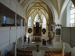 Die westlichen Fenster des Kirchenschiffes sind nicht so weit herabgezogen wie die anderen im Raum. Dies wird als Indiz für die Annahme gewertet, dass bereits in gotischer Zeit eine Empore vorhanden war.