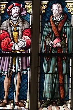 Die zwei- und dreiteiligen Maßwerkfenster im Chor besitzen eine Bleiverglasung, die zwischen 1894 und 1901 von der Glasmalerei K. J. Schultz in Marburg ausgeführt wurde.[2] Die beiden mittleren Fenster stellen die Kreuzigung und Auferstehung Christi dar. Auf dem linken Chorfenster wird Jesus dargestellt, der die Kinder segnet. Das rechte Fenster hat die Taufe der heiligen Lydia durch den Apostel Paulus zum Thema. Das sogenannte Reformatorenfenster ist Martin Luther und Philipp Melanchthon gewidmet, in deren Mitte der hessische Landgraf Philipp I. vertreten ist.