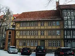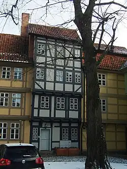 Das zum UNESCO-Weltkulturerbe gehörende Fachwerkhaus entstand in der Zeit um 1560. Eine Bauinschrift nennt das Jahr 1766.[1] Die mit einem Wappen versehene Inschrift J J K ZM verweist auf den Zimmermeister Johann Joachim Kohlwagen.[2] 1986 erfolgte eine tiefgreifende Sanierung des Hauses. Teile der ursprünglichen mit Knaggen verzierten Fassade blieben dabei erhalten und wurden wieder verwendet. Im Inneren befindet sich ein aus dem 18. Jahrhundert stammendes Treppenhaus.