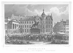 Ursprünglich fand der Markt der kleinen Stadt Düsseldorf am Ende der Straße „Altestadt“ statt. In den Jahren der ersten Stadterweiterung (1382–1394) entstand ein neuer Markt an der heutigen Stelle, der bereits 1392 urkundlich erwähnt wurde. Der Marktplatz war der Ort öffentlicher Bekanntgaben und Ereignisse. 1526/27 predigte und disputierte in einem hier gelegenen Gasthaus Friedrich Myconius, ein Freund und Anhänger des Reformators Martin Luther. 1544 zogen der Bürgermeister, der Rat, die Schöffen in ein Gebäude an den Platz. Zwischen 1570 und 1573 wurde dieses Rathaus, gelegen an der nördlichen Seite des Platzes, durch den Duisburger Baumeister Heinrich Tußmann erneuert. Die Entwürfe stammen möglicherweise von dem Architekten Alessandro Pasqualini.[1]