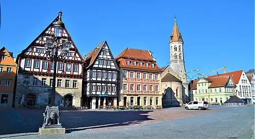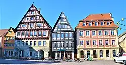 Die mittelalterliche, kleinparzellige Aufteilung der Bebauung hat sich über die Jahrhunderte erhalten. So hat zum Beispiel, der für das heutige Erscheinen des Platzes prägende, Stadtbaumeister Johann Michael Keller der Jüngere bei den barocken Neubauten häufig die Fundamente der Vorgängerbauten genutzt. Heute stehen die Mehrheit der Häuser am Platz unter Denkmalschutz. Die Gebäude verfügen hauptsächlich über drei Stockwerke und etwa dieselbe Höhe. Zumeist sind die Giebel zum Marktplatz ausgerichtet. Ebenfalls als Denkmäler eingestufte, hier nicht dargestellte Gebäude sind Marktplatz 2, 4, 5, 14 das über eine vollständig erhaltene Barocktreppe verfügt, 17–24, 26, 28–30, 32, 33 und 36.