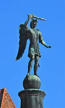 Das Kriegerdenkmal (fälschlicherweise auch „Siegessäule“) wurde vom Bildhauer Jakob Wilhelm Fehrle geschaffen und am 9. November 1935 eingeweiht. Das Kriegerdenkmal sollte zunächst der Gefallenen des Ersten Weltkriegs gedenken. Es ist aus 21 bronzenen Gussteilen gefertigt und war gestalterisch an die Trajansäule angelehnt. In der ersten Variante trug die Säule einen Adler mit Hakenkreuz auf seiner Spitze, 1952 wurde ein ebenfalls von Fehrle gefertigter Michael auf einer Kugel aufgesetzt. In der Amtszeit von Oberbürgermeister Franz Czisch wurde die Säule 1946 abgebaut und beim Gmünder Güterbahnhof eingelagert. Entgegen dem Willen des Oberbürgermeisters wurde die Säule nicht eingeschmolzen und nach seiner Abwahl wieder aufgestellt.[1] Heute ist die Säule dem Gedenken der Gefallenen des Ersten und Zweiten Weltkriegs gewidmet.