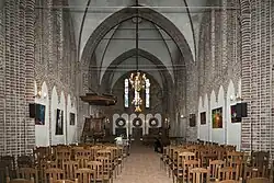 Das Innere verströmt den Geist der spätmittelalterlichen Gotik, insbesondere durch die 22 hohen Fenster, deren Glasmalereien von der Künstlerin Femmy Schilt-Geesink in den Jahren 1948–1970 entworfen und von ihrem Ehemann Johan Schilt ausgeführt wurden. Der spätgotische Stil ist auch am Taufstein und am Altarbild zu erkennen. Die barocke Kanzel von Jan Bitter sr. aus dem Jahr 1745 mit Schnitzereien von Casper Struiwig stammt aus der Kirche des abgerissenen Dorfes Oterdum in der Delfzijlster Oosterhoek. Die ursprüngliche Kanzel von 1695 aus der Marktpleinkirche war bereits 1907 in die Grote oder Sint-Nicolaaskerk in Monnickendam versetzt worden.