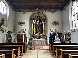Der Baukörper mit rechteckigem Grundriss und geradem Chorabschluss ist mit einem Tonnengewölbe mit Stichkappen und seitlich rundbogigen Fenstern versehen.