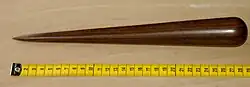 Kleinerer Marlspieker (mit Öhr zum Öffnen von Schraubschäkeln), um den ein Marlspiekerschlag geknüpft ist.