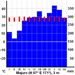 Das Klima ist feucht und warm bis heiß mit einer Regenzeit von Mai bis November, wobei die beständigen Winde Erleichterung verschaffen. Viele pazifische Taifune beginnen als Tropenstürme im Gebiet der Marshallinseln und werden auf dem Weg nach Westen in Richtung Marianen und Philippinen stärker.