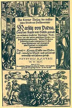 - ↑ Beispielsweise Gregorio Piaia: Marsilio e dintorni, Padua 1999, S. 54 f., 74–78; Diego Quaglioni: Aux origines de l’état laïque? In: Gian Mario Cazzaniga, Yves Charles Zarka (Hrsg.): Penser la souveraineté à l’époque moderne et contemporaine, Pisa/Paris 2001, S. 11–25, hier: 12–17, 24 f.