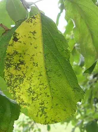 Schließlich brechen auf der Blattoberfläche kleine runde bis ovale schwarze Fruchtkörper durch, die als Acervuli bezeichnet werden. Vor allem bei länger anhaltender warm-feuchter Witterung kann innerhalb kurzer Zeit die Hälfte der Blätter infiziert sein, die sich gelb verfärben und schließlich vorzeitig abfallen, während die Früchte noch nicht voll ausgereift am Baum hängen. Bei starkem Infektionsdruck kann der Blattfall bereits ca. zwei Wochen nach der Infektion beginnen, was bei einigen Ausbrüchen bereits Mitte August der Fall war.[6] Aufgrund der reduzierten Blattmasse werden die Früchte nicht mehr ausreichend mit Nährstoffen versorgt, wodurch sie in der Entwicklung gestört werden. Die Einlagerung von Stärke ist reduziert und die Früchte haben ein niedrigeres Fruchtgewicht und färben mangelhaft aus, was zu einer reduzierten Fruchtqualität führt. Auch im Folgejahr führt die Erkrankung zu Ertragseinbußen, da die befallenen Bäume nur mangelhaft Blüten ansetzen und der Austrieb im kommenden Frühjahr gestört ist.[7]