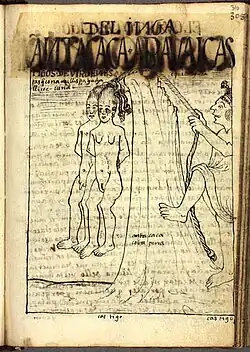 - Getty-Murúa: Hier handelt es sich um eine zweite Version der Chronik, die zwar auch in Peru sowie im Gebiet des heutigen Bolivien zusammengestellt, aber höchstwahrscheinlich in Spanien überarbeitet wurde. Diese Ausgabe wurde später zwar für den Druck freigegeben, blieb jedoch ebenfalls ungedruckt. Sie gelangte in die Hände des Büchersammlers, Autors, Humanisten und kastilischen Politikers Lorenzo Ramírez de Prado (1583–1658),[3] von wo es nach dessen Tod in die Bibliothek des Colegio Mayor de Cuenca in der Universitätsstadt Salamanca geriet, nach Auflösung der Colegios 1799 in die königliche Bibliothek und als Folge der Napoleonischen Kriege in den Besitz des Herzogs von Wellington (daher auch Wellington-Murúa genannt). Es wurde mehrfach verkauft und schließlich 1962–1964 in vereinfachter Form publiziert. Das Manuskript gelangte 1983 in den Besitz des Getty Research Institute; dort wurde es 2007–2008 sorgfältig ediert sowie faksimiliert.[4]