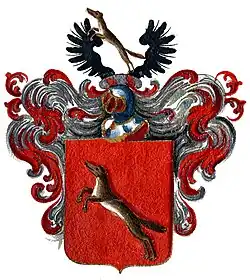 - Blasonierung des Freiherrenwappens von 1710: Geviert. Felder 1 und 4 in Gold ein natürlicher aufgerichteter Marder einwärtsgekehrt; Felder 2 und 3 in Rot ein auf einem grünen Hügel vorwärts gekehrter sitzender natürlicher Wolf mit ausbreiteten Vorderpranken. Auf dem Helm mit rechts rot-goldenen und links rot-silbernen Decken der Marder aus einer Krone wachsend.[7]