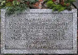 Auf dem Goldbergplatz wurde 1985 ein Gedenkstein zur Erinnerung an die Ermordung des Ehepaars eingeweiht, der in die hochgezogene Naturstein-Randpflasterung eines großen, erhöhten Blumenrondells eingelassen wurde.[16] Der aus Granit bestehende Gedenkstein trägt folgende Inschrift: