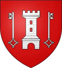 Wappenbeschreibung: In Rot ein silberner gemauerter Zinnenturm mit zwei offenen Fenstern und einem Torbogen von je einem pfahlgestellten silbernen Schlüssel mit Kreuzeinschnitt im nach außen zeigenden Bart und einer Vierpassreite begleitet.