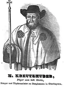 Im Alter von 62 Jahren brach Kreutzhuber am 18. Dezember 1838 zu Fuß von Burghausen zu einer Pilgerreise nach Jerusalem auf, angeblich wegen eines Gelübdes.[2] Die öffentliche Aufmerksamkeit war ihm dabei sicher: „Eine große Menge Neugieriger und Theilnehmender strömte dem 53-jährigen Mitbürger nach, als er in Pilgertracht, den Pilgerhut auf dem Kopfe, mit einem ledernen Pilgerkragen, an der Brust zwei Muscheln, in der Rechten den Pilgerstab, an seiner linken Seite die Reisetasche tragend, rüstig über den Marktplatz und die Salzachbrücke schritt. Seine Gattin begleitete ihn weinend eine weite Strecke. Bei einer Feldkapelle betete er andächtig und gab dann noch vielen Schulkindern, die der neue Anblick eines Pilgers ihm nachgezogen hatte, gute Lehren.“[3]