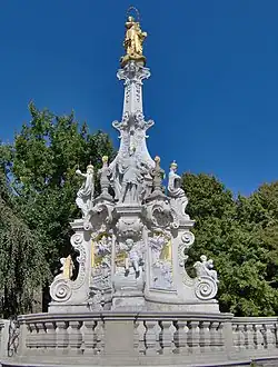 Die elf Meter hohe Statuengruppe wurde 1750 von Imre Esterházy de Galántha, Erzbischof von Esztergom, aus Dankbarkeit für das Ende der Pest errichtet, die 1749 die Stadt verwüstete. Das Gebäude, auch Votivpestsäule genannt, wurde vom österreichischen Steinmetz Martin Vögerl aus Sandstein errichtet.[9]