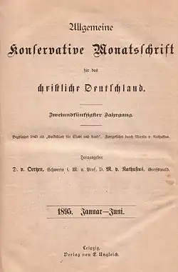 - ↑ Allgemeine konservative Monatsschrift für das christliche Deutschland, zweiundfünfzigster Jahrgang. Begründet 1843 als Volksblatt für Stadt und Land. Fortgeführt durch Martin von Nathusius. Herausgeber: D. von Oertzen, Schwerin i. M. und Prof. Dr. Martin von Nathusius, Greifswald, hier: Sammelbindung, Januar–Juni 1895, Verlag von E. Ungleich, Leipzig, o. J.