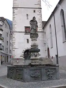 Der Martinsbrunnen in der Bündner Kantonshauptstadt Chur steht in der Altstadt auf dem Martinsplatz vor dem Turm der Martinskirche.