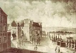 Am 2. März 1481 brach ein Brand in der Martinsburg aus und zerstörte die Anlage weitgehend.[1] Es ist nicht ganz sicher, ob der durch Bilder überlieferte Bau mit seinen Ecktürmen als Ruine wieder aufgebaut wurde oder nach 1481 weitgehend nach einem neuen Plan entstand. Der Wiederaufbau zog sich bis in die Zeit um 1500 hin.