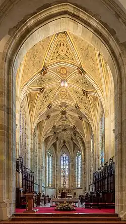 Mit den Umbauarbeiten – nach Grundsätzen der Romantik – wurde der Wiener Architekt Josef Lippert[3] beauftragt. Der jetzige Hauptaltar im Chorraum, welcher sich auf drei Stufen erhebt, ist aus Linden- und Eichenholz, vergoldet und polychrom gefasst. Er stellt eine Kirche dar, ähnlich mittelalterlichen Reliquienschreinen. Er wurde nach Lipperts Entwürfen vom Tischlermeister Ignaz Karger und dem Maler Carl Jobst gebaut. Die sechs Figuren der Heiligen, ebenfalls aus Lindenholz geschnitzt, sind das Werk des Wiener Bildhauers Johann Hutterer[4]. Links vom Sakramentshäuschen sind das: der heilige Georg, die heilige Elisabeth und der heilige Adalbert; rechts davon die Heiligen Nikolaus, Katharina und Florian.[5]