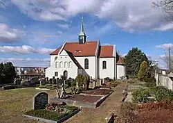 Die Kirche liegt in Plossen, hoch auf dem Bergsporn über der Mündung der Triebisch in die Elbe. Die Saalkirche ist romanischen Ursprungs und stammt aus der Mitte des 12. Jahrhunderts. Im Jahr 1437 wurde die Kirche nach Schäden in den Hussitenkriegen wiederhergestellt. 1683 wurde das Innere mit Decken, Emporen und Gestühl gänzlich erneuert. Im Jahr 1885 wurde ein Anbau im Westen hinzugefügt und der Südanbau verändert; ein neuer Dachreiter wurde erbaut. Im Jahr 1981 erfolgten weitere Reparaturen, wobei an der Westwand eine zweibogige Arkade freigelegt wurde, die möglicherweise einst zu einem Raum in einem ehemaligen, breiten Westturm führte. Im Giebelmauerwerk des Chorquadrats wurden Fragmente romanischer Bauplastik gefunden.