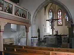 Westlich des Turms schließt das einfache Kirchenschiff an. Bedingt durch die unterschiedliche Einrichtung zu unterschiedlichen Epochen bot die Kirche zeitweise über 500 Sitzplätze, seit der Renovierung 1976 sind es 370. Im Westen und im Norden läuft eine Empore mit Tafelbildern aus dem 18. Jahrhundert um, auf der Westempore befindet sich die neuzeitliche Kirchenorgel. Das zweimanualige Instrument mit 15 Registern wurde 1955 von der Firma Walcker erbaut.
