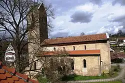 Die romanische Säulenbasilika aus Stubensandstein ist die älteste Kirche in der Umgebung. Sie wird im Innern geprägt durch ein hohes, schmales Mittelschiff mit vier Langhausjochen aus schlichten, massiven Säulen, die auch durch die schlichten koppelschildbesetzten Würfelkapitelle den Einfluss der Hirsauer Bauschule verraten. Alle drei Apsiden im Osten haben einen tonnengewölbten Vorchor, der aber nach außen rechtwinklig abschließt. Die Seitenapsiden beherbergten im Mittelalter die Nikolauskapelle im Norden und die Maria-Magdalenen-Kapelle im Süden, die zumindest im Spätmittelalter eigene Kaplaneien waren.[2] Im Westen war ursprünglich eine Doppelturmfassade geplant und wohl auch gebaut, von der nur die Turmstümpfe und eine tonnengewölbte Vorhalle (Paradies) dazwischen erhalten sind. Der über 500 Jahre alte spätgotische Turm wurde später vor die ursprünglich offene Vorhalle gebaut. Er irritiert durch seine deutlich schiefe Stellung.