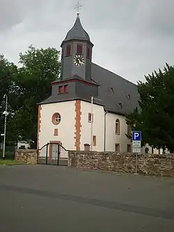 1617–23 wurde das Langhaus nach Norden verbreitert. Dadurch steht der Kirchturm nicht mehr in der Längsachse, sondern bündig mit der südlichen Außenwand des Langhauses. Die steinernen unteren Geschosse des Kirchturms sind mit einem achteckigen Geschoss aus schiefergedecktem Holzfachwerk versehen, das die Turmuhr und hinter den Klangarkaden den Glockenstuhl beherbergt. Darauf sitzt eine Glockenhaube. In den mit einer Flachdecke überspannten Innenraum, die von Unterzügen getragen wird, wurden 1824 Emporen eingebaut. Über dem Eingangsportal des Turms befindet sich ein Scheibenkreuz aus dem 14. oder 15. Jahrhundert. Es ist in ca. 3,5 m Höhe eingemauert und hat einen Durchmesser von 14,5 cm. Damit ist es der kleinste hessische Scheibenkreuz-Grabstein. Kunsthistorisch stellt es eine einfache bäuerliche Arbeit dar, die vor Ort entstanden ist.[3] In der Westwand des Kirchenschiffs befindet sich in Höhe der Emporen ein Hagioskop, das in die Turmwand eingelassen ist. Nach einem dendrochronologischen Gutachtens waren die Baumaßnahmen 1623 abgeschlossen.[4]