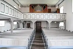 Die Innenausstattung der Kirche bestand bis zur Restaurierung 1965 aus barocken Elementen, die durch schlichte graue Holzbänke und eine etwa zwei Meter hohe Kanzel ersetzt wurden. Altar und Kanzel sind in Weiß mit vergoldeten Zierelementen gehalten. Der Saal verfügt außerdem über eine Empore, die an der West- und Südseite eingebaut ist.