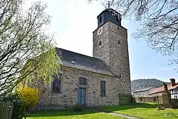 Die in etwa geostete Saalkirche besteht aus dem barocken Kirchenschiff und dem mittelalterlichen Westturm. Die gesamte Kirche ist aus Bruchsteinen gebaut, das Walmdach mit Schieferschindeln gedeckt. Die Türen, Gebäudeecken und Fenstereinfassungen bestehen aus behauenen Steinen. Der rundbogige Haupteingang mit verschiefertem Vordach befindet sich an der westlichen Frontseite des Turmes; an der nördlichen Längsseite des Schiffes gab es früher einen rechteckigen Nebeneingang, dessen Türen außen noch vorhanden sind. Innen wurde er zu unbekannter Zeit vermauert, wahrscheinlich um die Kirchenbänke bis an die Außenmauer aufstellen zu können und dadurch mehr Sitzplätze zu gewinnen. Die Fenster des Kirchenschiffs mit flachen Stichbogen bestehen aus Butzenscheiben mit igen Bleifassungen. In einen etwa 50 cm breiten und 15 cm hohen Datumsstein von einem Vorgängergebäude an der Nordseite des Kirchenschiffs ist die Jahreszahl 1490 („ANNO DOMI MCCCCLXXXX“) eingemeißelt.[2]